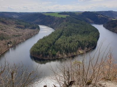 Der Hohenwarte See erstreckt sich durch eine Landschaft mit steilen bewaldeten Hängen und zahlreichen Windungen, die eine Fjordlandschaft in Thüringen bilden.