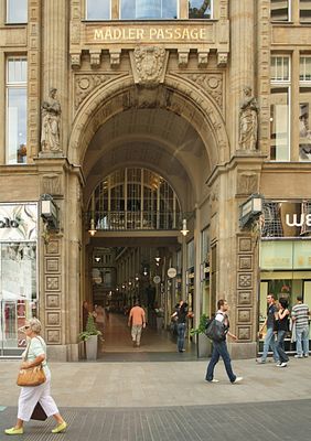 Geschäftshauskomplex Grimmaische Straße 2; 4, Geschäftshauskomplex in geschlossener Bebauung mit Passage (Mädlerpassage) und Restaurant Auerbachs Keller (s. a.: Neumarkt 14)