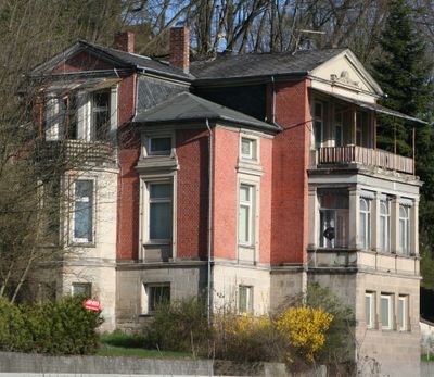 Baudenkmal D-4-63-000-729 in Coburg im Ortsteil Coburg, Villa, zweieinhalbgeschossiger Walmdachbau in Hanglage, Ziegelmauerwerk mit Sandsteingliederung über Sandsteinquadermauer, mit straßenseitigem dreigeschossigen Risalit mit Zwerchhaus und Erker mit Altane, seitlichem dreigeschossigen Risalit mit Zwe