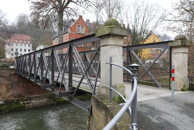 Baudenkmal D-4-63-000-722 in Coburg im Ortsteil Coburg, Brockardt-Brücke, Fußgängersteg in Eisenfachwerk mit Brückenkopfpfeilern mit gewölbter Deckplatte und Kugelaufsatz, von Christian Leins, Stuttgart, 1891.