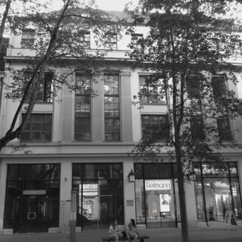 Das Gebäude in der Schillerstraße 17-19 zeigt eine neobarocke Fassade mit detaillierten architektonischen Elementen und einen modernen Anbau mit komplexer Dachkonstruktion.
