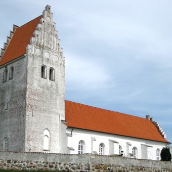 Die Kirche steht neben Grønsalen, einem 100 Meter langen Grabhügel, den die lokale Folklore mit der Grabstätte von Königin Fane und König Grøn Jæger verbindet.