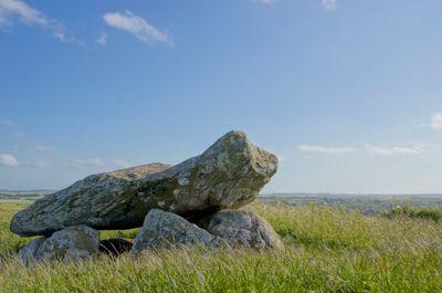 Der große Deckstein wiegt mehrere Tonnen und ruht auf den darunter liegenden Steinblöcken als Zentrum der Konstruktion. Diese massenreiche Platzierung zeigt das beeindruckende Ingenieurwissen der Menschen, die das Grab errichteten.