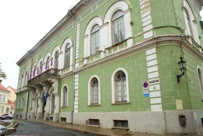 Das Estnische Ritterhaus ist ein Renaisance-Revival-Gebäude an der Kiriku plats 1 in Tallinns oberer Altstadt mit großen Fenstern, symmetrischem Aufbau und reich verziertem Steinfassade. Der vier-stöckige Bau zeigt typische Merkmale des 19. Jahrhunderts mit aufwendigen architektonischen Details.