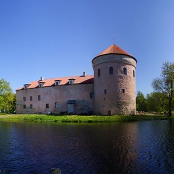 Die Steinfestung steht auf einer künstlichen Insel, die durch das Aufstauen des Liivi-Flusses entstand, mit stabilen Mauern und Verteidigungstürmen.