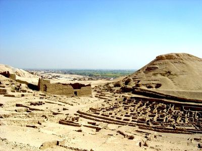 Deir el-Medina ist eine archäologische Stätte einer antiken Arbeiter- und Handwerkersiedlung in Luxor mit Überresten von Häusern, Verwaltungsgebäuden und Gräbern in einem rechteckigen Grundriss. Die Gebäude sind von Schutzwällen umgeben, und die Ausgrabungen zeigen die typische Stadtplanung dieser Zeit.
