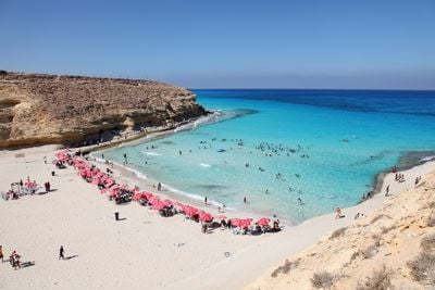 Besucher erreichen den Strand mit Kleinbussen von der Zentralbank Mersa Matruh und folgen einem absteigenden Pfad von der Klippe.