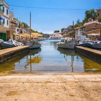 Der Hafen von Cala Figuera erstreckt sich ins Landesinnere mit weißen Häusern, die beide Seiten des Wassers säumen.