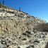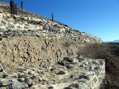 Das Gelände erfordert vorsichtige Navigation aufgrund von Steigungen bis zu 90 Prozent, mit Zugangswegen zu den Überresten.