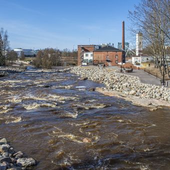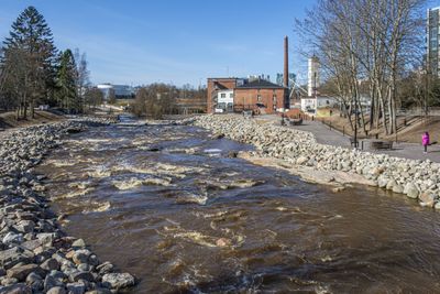 Die Tikkurilankoski-Stromschnellen erstrecken sich über 400 Meter von der Kuninkaalantie-Brücke und bilden natürliche Wasserformationen am Keravanjoki-Fluss.