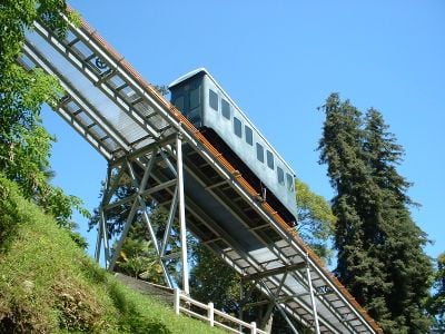 Die Standseilbahn erstreckt sich über 103 Meter mit einer Steigung von 30% und verbindet den Bahnhof mit der Innenstadt durch zwei Metallkabinen.