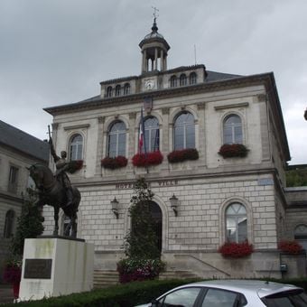 Die Bronzeskulptur zeigt Jeanne d'Arc zu Pferd mit einem Schwert in der Hand vor dem Rathaus von Vaucouleurs.