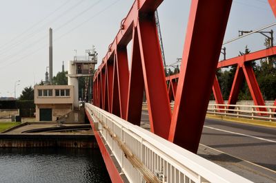 Die rote Farbe und das moderne Design der Brücke spiegeln die architektonische Wiedergeburt von Le Havre nach dem Zweiten Weltkrieg wider.