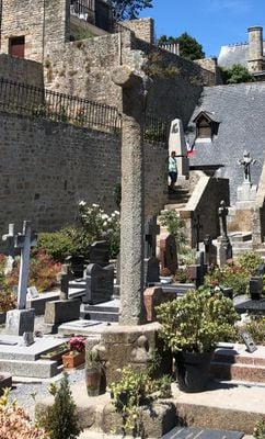 Das Steinkreuz steht auf dem Gemeindefriedhof von Le Mont-Saint-Michel, umgeben von 114 Gedenkgräbern mit historischen Inschriften.
