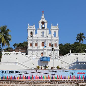 Die Kirche der Unbefleckten Empfängnis ist ein barocker Sakralbau mit strahlend weißem Anstrich und zwei Glockentürmen auf einer erhöhten Position in Panaji. Der Eingang wird von einer Treppenanlage mit Zickzack-Struktur vom angrenzenden Garten aus erreicht, was dem Aufstieg zur Kirche eine besondere Qualität verleiht.
