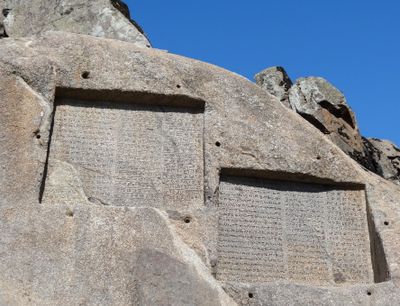 Die Ganj Nameh zeigt zwei große Steintafeln von 2 mal 3 Metern, die in den Granit des Alvand-Berges auf 2000 Metern Höhe gemeißelt wurden.