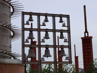 Der erhaltene Industrieschornstein, umhüllt von Edelstahl, trägt ein 60 Meter hohes Kreuz und verbindet die religiöse Struktur mit dem industriellen Erbe.