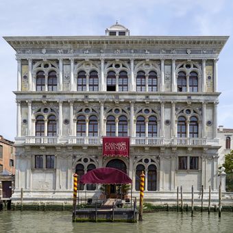 Ca' Vendramin Calergi erhebt sich dreistöckig am Großen Kanal mit klassischen Säulen und dekorativen Bögen an seiner Marmorfassade.