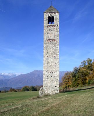 Der Campanile di San Martino ist eine romanische Glockenturmanlage in Bollengo, die sich über sechs Geschosse erstreckt und fünf Stockwerke mit hängenden Bögen zeigt. Die Struktur wird von schlanken Pilastern gestützt, die vertikale Linien betonen und das charakteristische Aussehen dieses mittelalterlichen Bauwerks prägen.