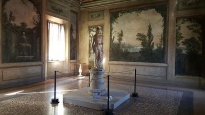 Der Raum beherbergt Canovas berühmte Marmorstatue Apollino von 1797 und zeigt dekorative Elemente wie gemalte Brunnen, geflügelte Putti, Blumen und Vögel zwischen den botanischen Motiven.