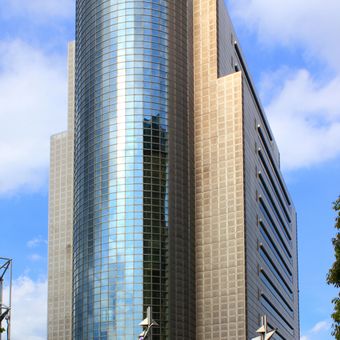 Das Sumida-Stadtbüro zeigt eine moderne Architektur mit klaren Linien und großen Glasflächen mit Blick auf den Sumida-Fluss.