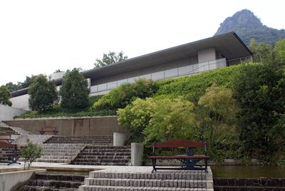 Die Shikoku Mura Galerie, entworfen vom Architekten Tadao Ando, zeigt Bronzen, Kalligraphien, Keramiken, Gemälde und Skulpturen in einem modernen Gebäude am Fuße des Berges Yashima.