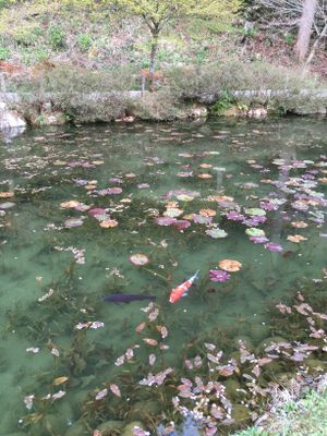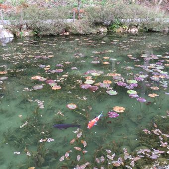 Monet's pond ist ein künstlicher Teich in der Nähe des Nemichi-Schreins in Seki, Japan, mit türkisfarbenem Wasser und schwimmenden Seerosen. Japanische Karpfen bewegen sich unter der Oberfläche, während Ahornbäume entlang der Ufer stehen und im Herbst ihre Blätter verfärben.