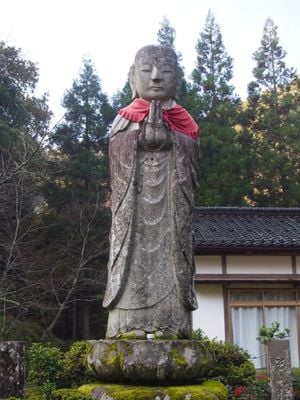 Die Heichi-jizo Statue stellt Kṣitigarbha dar und zeigt die Figur eines buddhistischen Mönchs, der in Stein gehauen im Heichi-jizo Park steht.