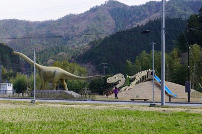 Der Park zeigt ein 15 Meter langes Monument des Tambaryuu-Dinosauriers neben Spielgeräten in Form prähistorischer Kreaturen.