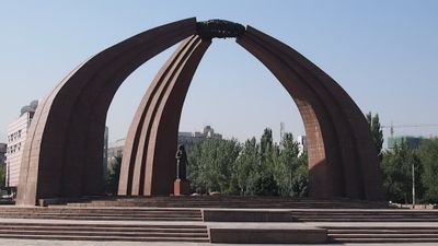 Victory Square ist ein großer öffentlicher Platz im Zentrum von Bishkek, Kirgistan, mit einem markanten Denkmal aus Marmor und Granit. Die Struktur besteht aus drei gebogenen Granitpfeilern, die traditionelle Jurten-Streben darstellen, mit einer ewigen Flamme in der Mitte.
