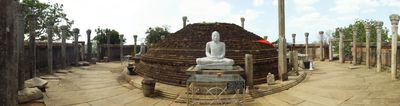 Girihandu Seya ist ein Buddhischer Tempel auf einem Hugel in der Region Trincomalee und verfugt uber eine zentrale Stupa, die von einer ringformigen Struktur umgeben ist. Die Anlage enthalt Steinsaulen, die konzentrische Muster bilden und den heiligen Bereich definieren.