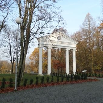 Der Herrenhauscomplex steht am westlichen Rand von Jurbarkas, mit zwei erhaltenen Flügeln und restaurierten Säulen des zentralen Palastes.