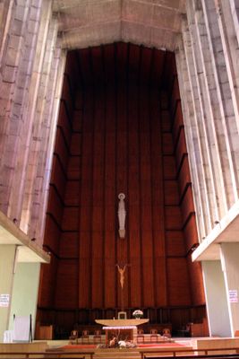 Die Notre-Dame-de-Lourdes Kirche weist eine Betonkonstruktion mit geometrischen Formen und große Buntglasfenster auf einer ganzen Wand auf.
