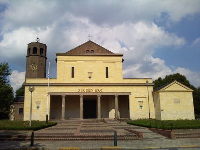 Die aktuelle Kirche, fertiggestellt 1954, ersetzte ihren im Zweiten Weltkrieg zerstörten Vorgängerbau und integrierte drei erhaltene Glocken der ursprünglichen Struktur.