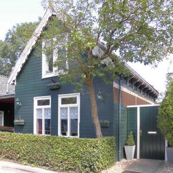Houten huis met gerabatte wanden met zolderverdieping onder zadeldak met puntgevel met makelaar