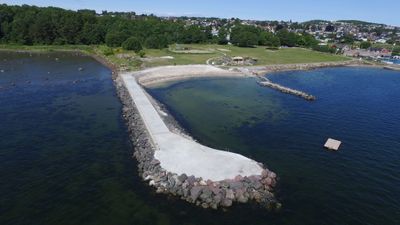 Der Sandstrand erstreckt sich entlang des westlichen Ufers des Oslofjords und bietet Ausblicke auf die Küste und maritime Aktivitäten.