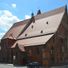 Das Backsteingebäude zeigt traditionelle gotische Architekturelemente mit Spitzbögen, steilen Dächern und detailliertem Mauerwerk.