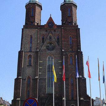 Die Lutherische Marienkirche zeigt einen Ziegelbau mit Spitzbögen, Rippengewölben und zwei identischen Türmen an der Fassade.