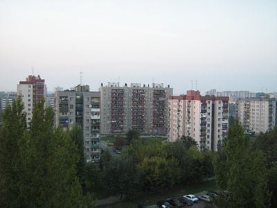 Das Viertel umfasst mehrere Wohngebäude in einer geplanten Anordnung mit Grünflächen zwischen den Wohnblöcken.
