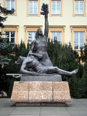 Der Granitsockel des Denkmals stammt vom abgerissenen Hindenburg-Mausoleum, das während der Zeit des Dritten Reichs errichtet wurde.