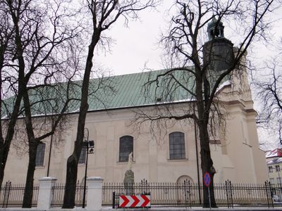 Die Bartholomäuskirche weist Renaissance-Architekturelemente mit einem markanten Dachreiter auf ihrer symmetrischen Fassade an der Kazimierza-Wielkiego-Straße auf.