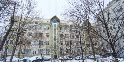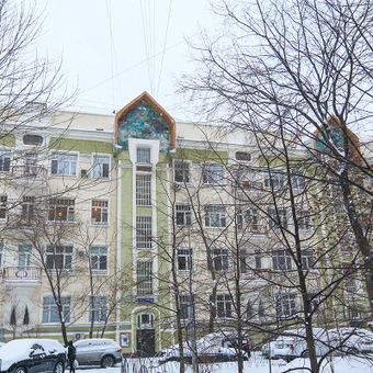 Das Mietshaus steht am Novinskiy Boulevard und präsentiert eine Fassade, die die russische nationalromantische Architekturbewegung veranschaulicht.