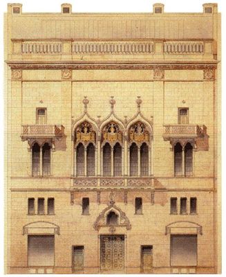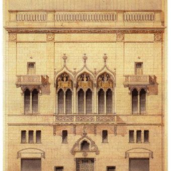 Das Künstlerhaus zeigt eine Fassade aus Portland-Kalkstein mit ornamentalen Details, einschließlich Wandöffnungen und kleeblattförmigen Fenstern.