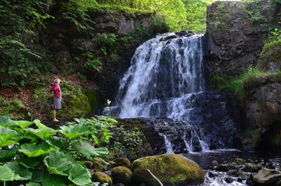 Der Forsemölla-Wasserfall fällt 15 Meter durch vertikale Felswände im Naturschutzgebiet Sträntemölla-Forsemölla, umgeben von Buchenwäldern und Hügeln.