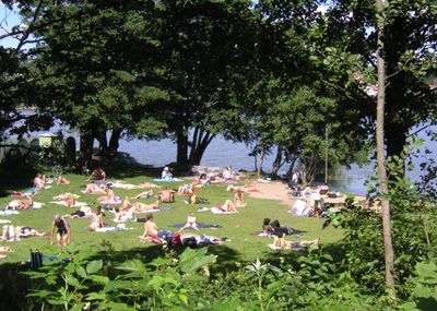 Anwohner aus Lappkärrsberget versammeln sich während der Sommermonate regelmäßig an diesem Strand, der als sozialer Treffpunkt dient.