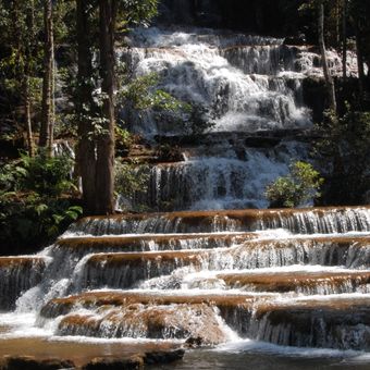 Der zentrale Wasserfall fällt über 97 verschiedene Ebenen und fließt das ganze Jahr über in ein natürliches Becken an seiner Basis.