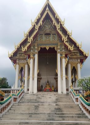 Der Tempel weist traditionelle thailändische Architekturelemente mit verzierten Dächern, weißen Wänden und detaillierten Buddha-Statuen in der Haupthalle auf.