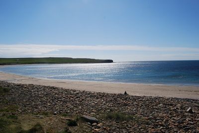 Die Bucht von Skaill erstreckt sich entlang der Westküste von Mainland Orkney mit einer weiten Sandfläche, die auf den Atlantischen Ozean trifft.