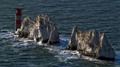 Drei vertikale Kreidefelsen ragen 30 Meter aus dem Ärmelkanal am westlichen Ende der Isle of Wight empor.