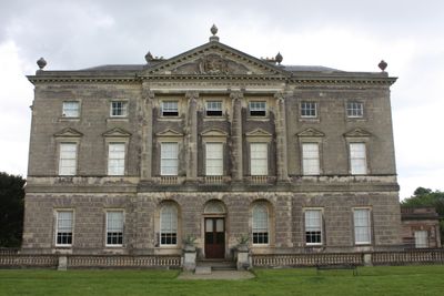 Das Herrenhaus zeigt zwei gegensätzliche Architekturstile, mit klassischem palladianischem Design auf einer Seite und gotischen Elementen an der gegenüberliegenden Fassade.